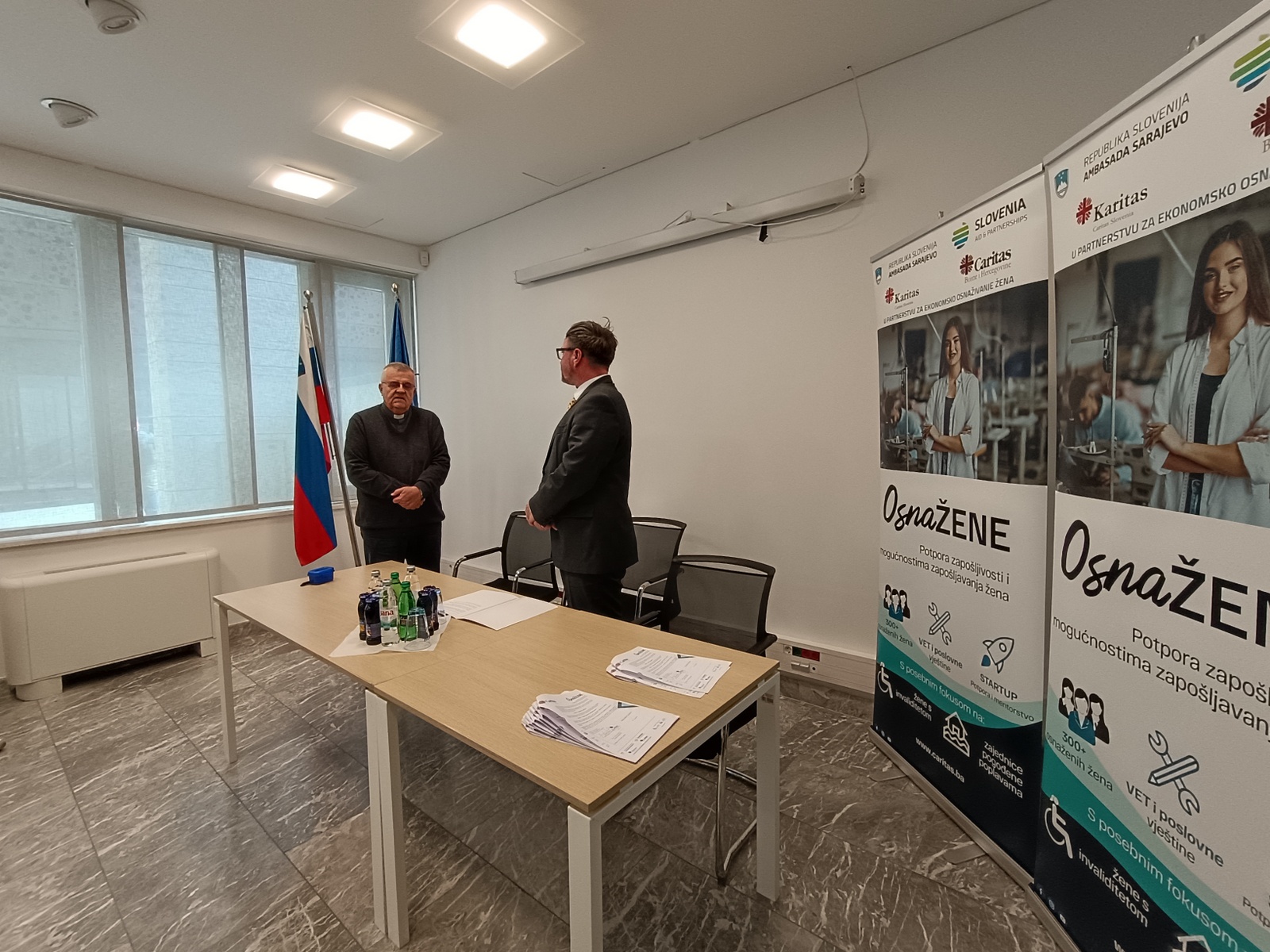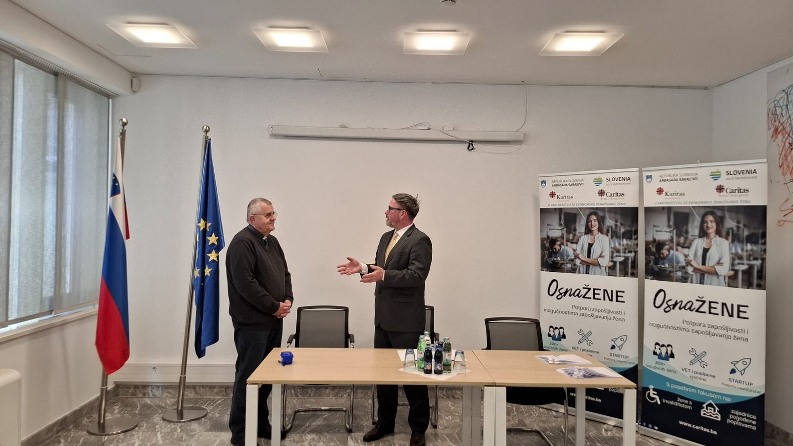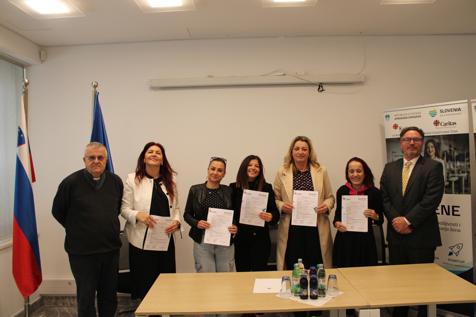U nazočnosti NJ. E. Damijana Sedara, veleposlanika Republike Slovenije u BiH, ugovore su potpisali mons. Tomo Knežević u ime Caritasa Bosne i Hercegovine zajedno sa šest žena čije su poslovne ideje prepoznate kao najperspektivnije.