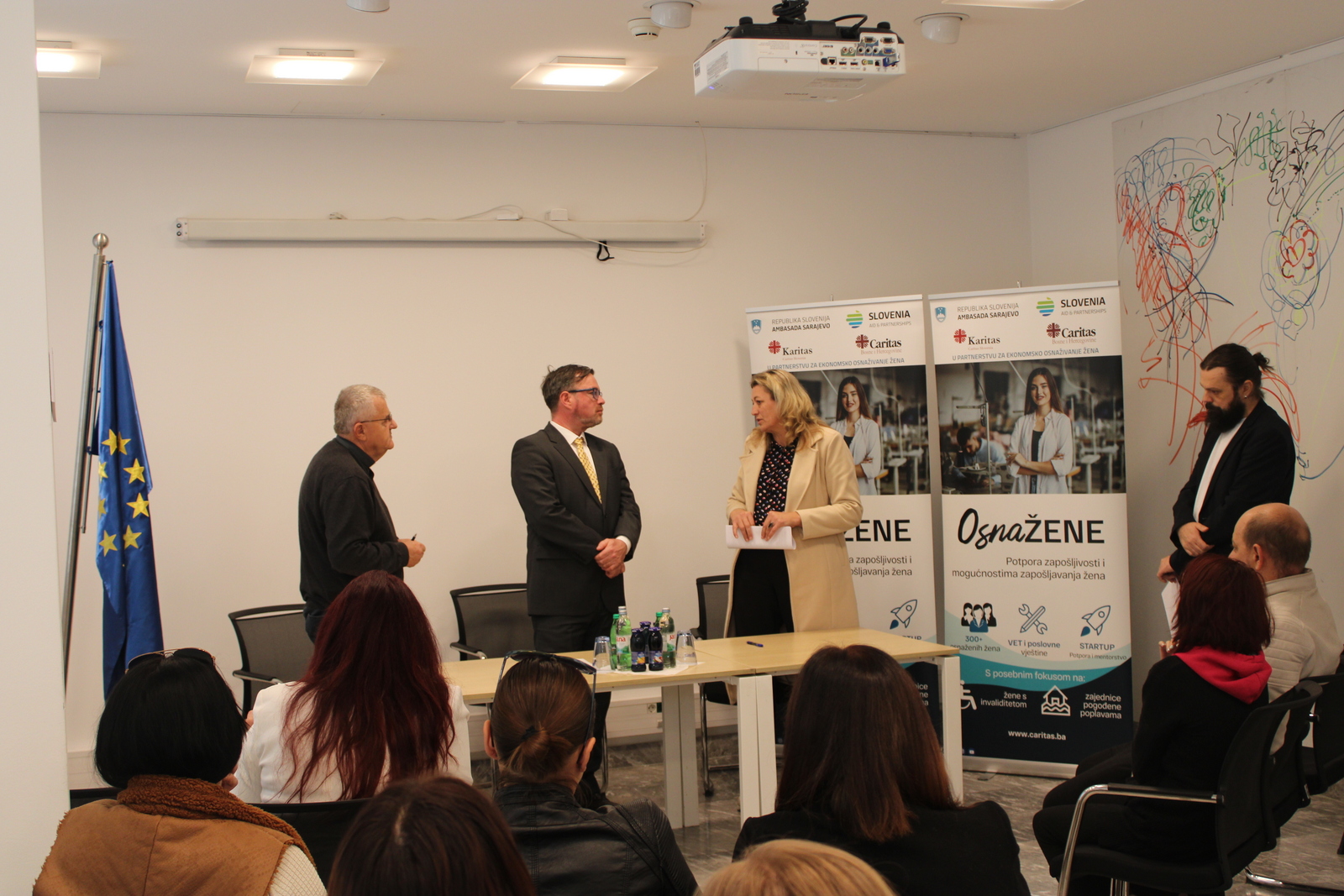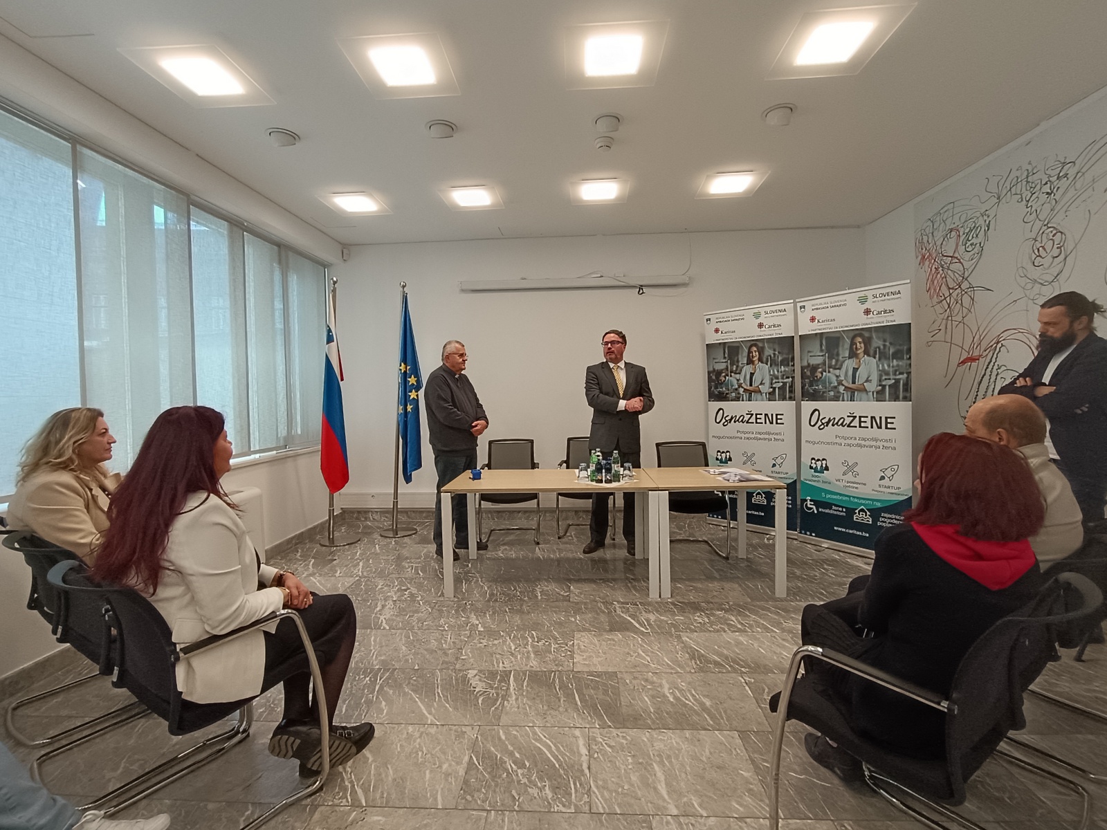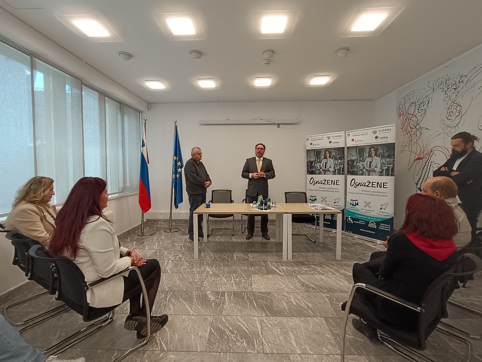 NJ. E. Damijan Sedar, veleposlanik Republike Slovenije u BiH, istaknuo je kako Slovenija s ponosom podržava projekte koji stvaraju prilike, ne ovisnost. OsnaŽENE je primjer održive solidarnosti – ulaganja u žene koje imaju znanje, volju i viziju. One danas pokreću male biznise, ali sutra mogu pokretati lokalne ekonomije, naglasio je Sedar.