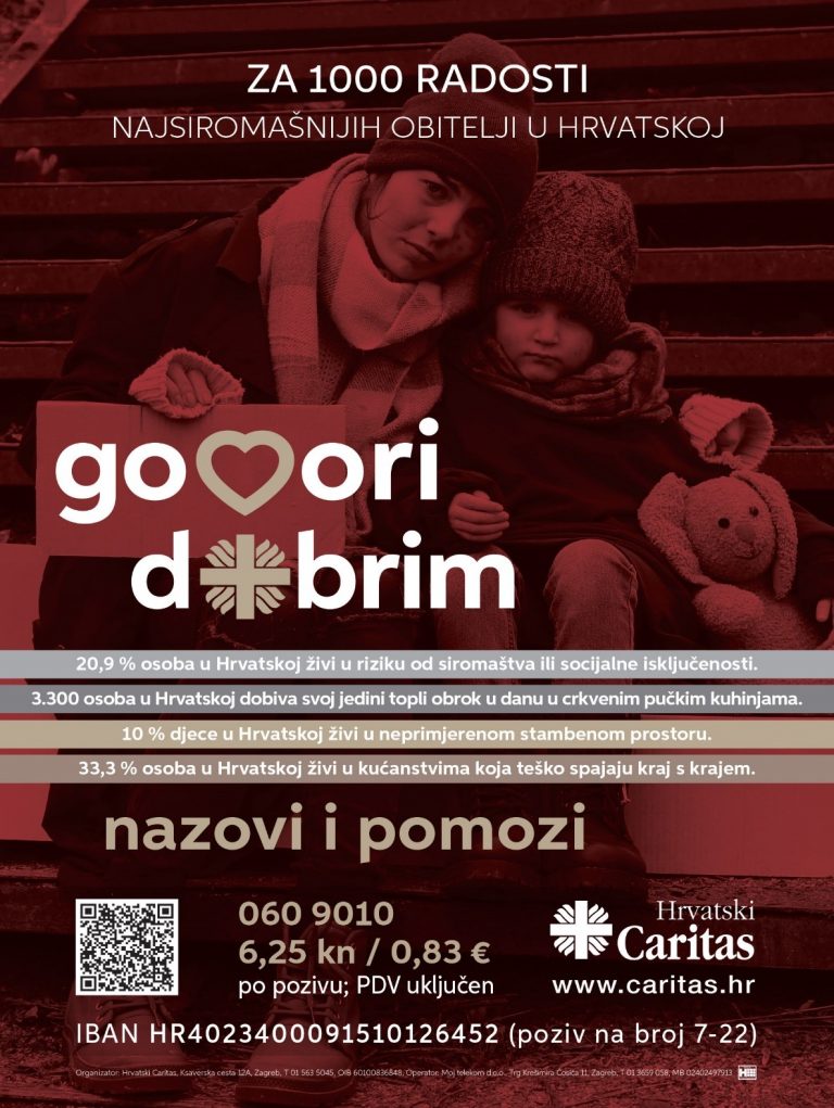 Program Hrvatskog Caritasa „Za 1000 radosti“, koji se ove godine vodi pod sloganom „Govori dobrim!“ i potiče na socijalnu osjetljivost i suodgovornost izraženu dobrim gestama, inicijativama i djelima, već 20 godina u središte pozornosti stavlja socijalno i zdravstveno ugrožene obitelji koje svakodnevno vode bitku protiv siromaštva i socijalne isključenosti.