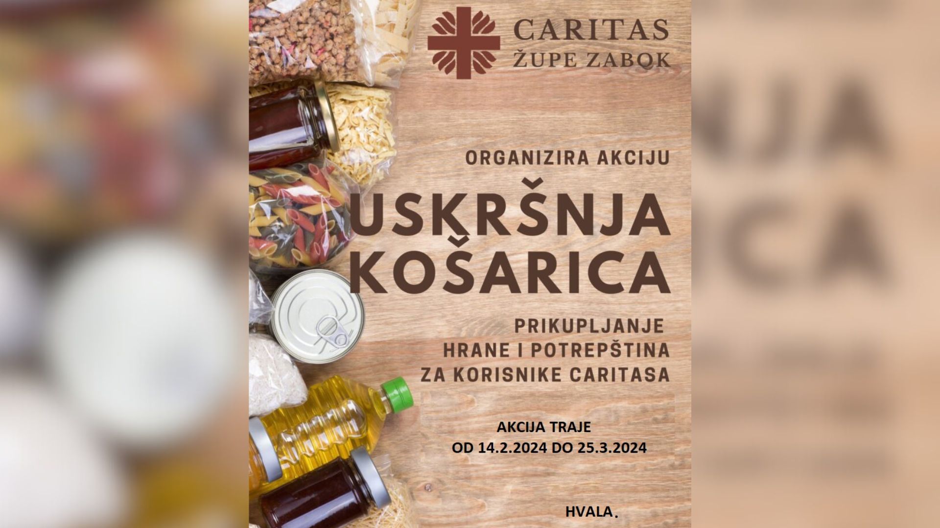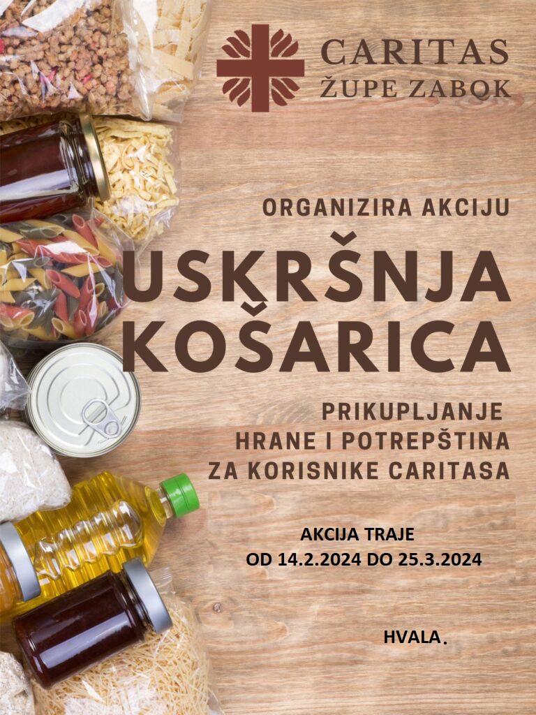 Humanitarna akcija „Uskršnja košarica 2024.“ u organizaciji Caritasa Župe sv. Jelene Križarice u Zaboku počela je u srijedu, 14. veljače te će trajati do ponedjeljka, 25. ožujka 2024., izvijestio je Caritas Župe sv. Jelene Križarice.