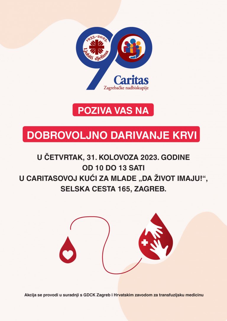 Caritas Zagrebačke nadbiskupije poziva građane na dobrovoljno darivanje krvi, koje organizira u povodu obilježavanja 90. obljetnice djelovanja. Akcija će se provesti 31. kolovoza od 10 do 13 sati u Caritasovoj Kući za mlade „Da život imaju!“, na adresi Selska cesta 165 u Zagrebu.