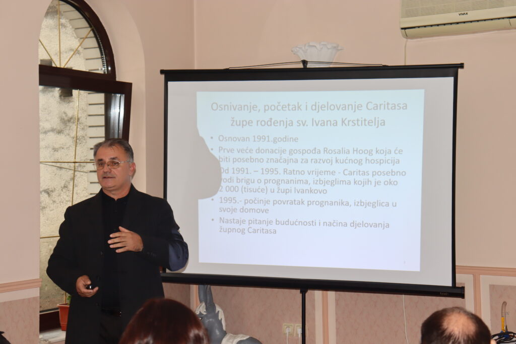Voditelj župnog Caritas u Ivankovu Milan Stjepanović u svojoj je prezentaciji predstavio povijest i rad župnog Caritasa u Ivankovu. Središte njihovog djelovanja projekt je „Kućni hospicij“ kojim je otvorena „posudionica“ pomagala za bolesnike. Danas je to najveća posudionica u Hrvatskoj, ali i regiji. Trenutno skrbi za oko tisuću bolesnika.