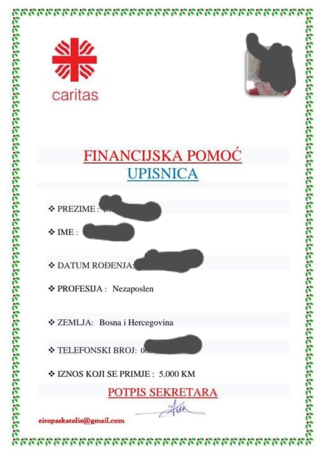 Ovih dana u Sarajevu su se pojavile osobe koje se predstavljaju kao djelatnici Caritasa, bez navođenja kojeg Caritasa. Obraćaju se starijim osobama. Pri tom im obećavaju poveću financijsku donaciju Caritasa uz uvjet da im ispune Upisnicu s traženim informacijama koje će im kasnije poslužiti u nedozvoljene i kažnjive radnje. O tome govore dvije skenirane slike koje prilažemo.