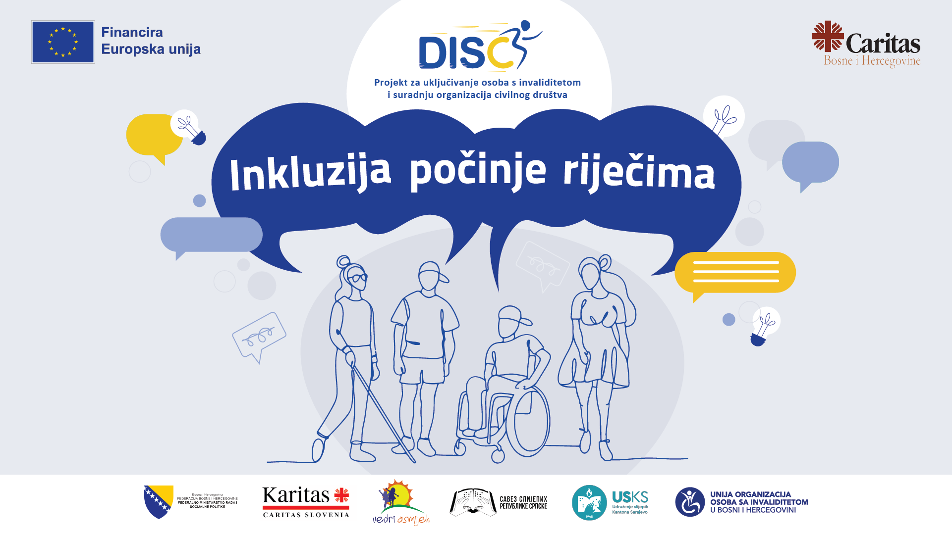 Kampanja „Inkluzija počinje riječima“ jedna je od aktivnosti projekta DISC, koji je započeo 1. veljače 2024. godine i traje do 31. siječnja 2027. godine, provodi se na području cijele Bosne i Hercegovine. Partneri na projektu su Udruga roditelja i djece s posebnim potrebama Vedri osmijeh iz Mostara, Udruženje slijepih Kantona Sarajevo, Unija organizacija osoba s invaliditetom u BiH i Savez slijepih Republike Srpske. Cilj projekta je unaprjeđenje položaja osoba s invaliditetom i jačanje kapaciteta organizacija koje ih predstavljaju, a realizira ga Caritas Bosne i Hercegovine u suradnji s partnerima. (caritas.ba)