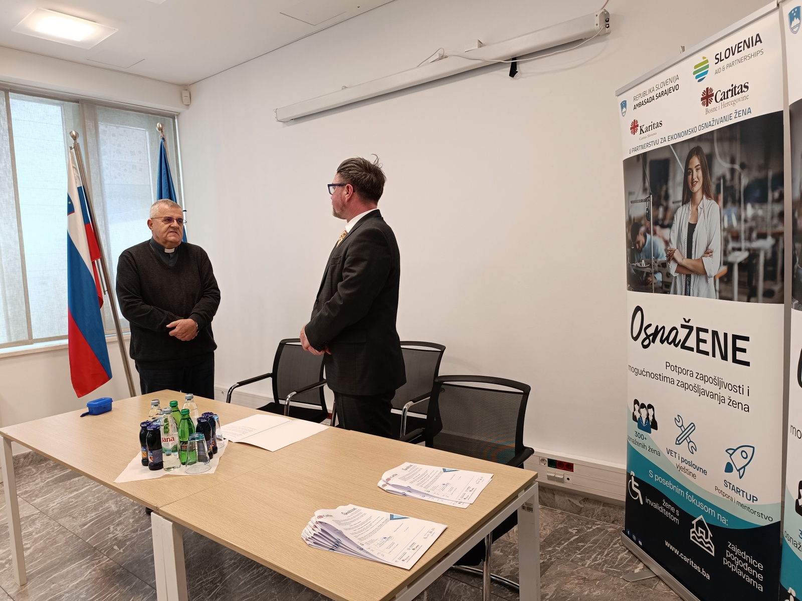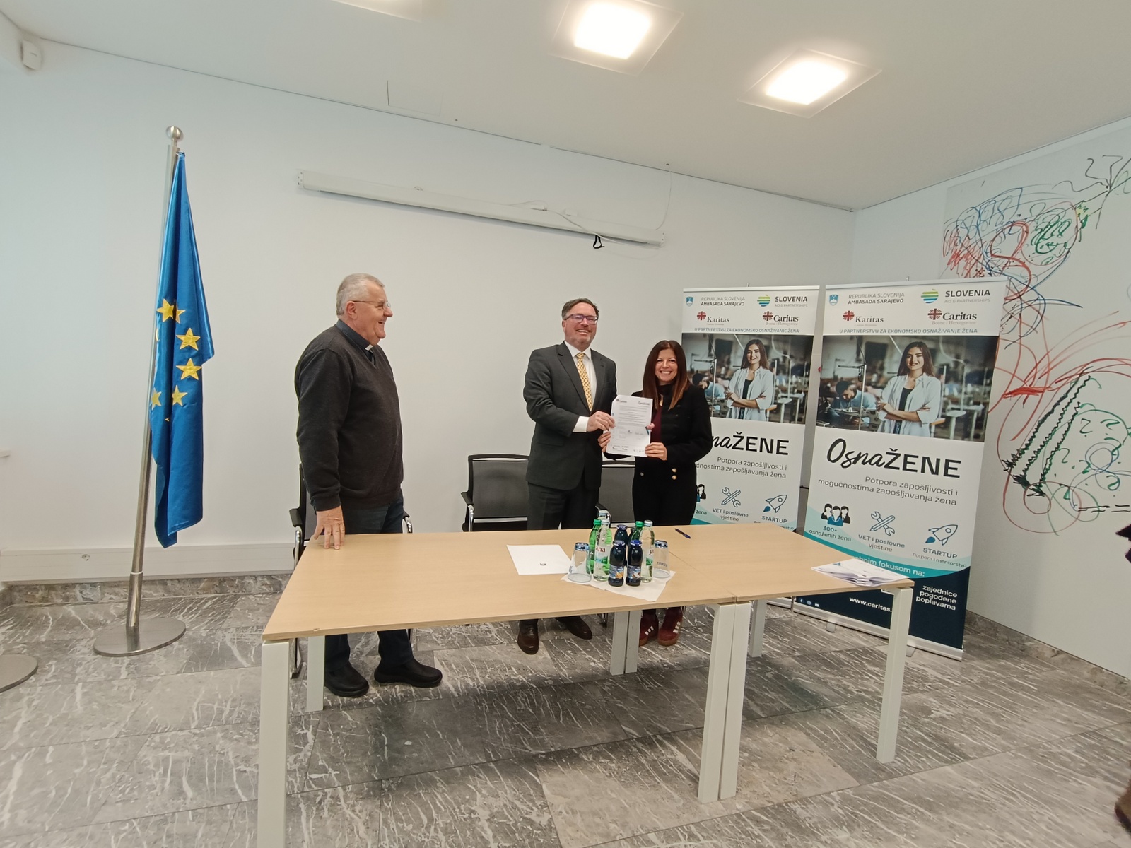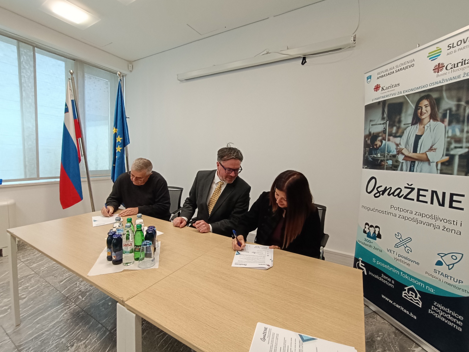 U nazočnosti NJ. E. Damijana Sedara, veleposlanika Republike Slovenije u BiH, ugovore su potpisali mons. Tomo Knežević u ime Caritasa Bosne i Hercegovine zajedno sa šest žena čije su poslovne ideje prepoznate kao najperspektivnije.