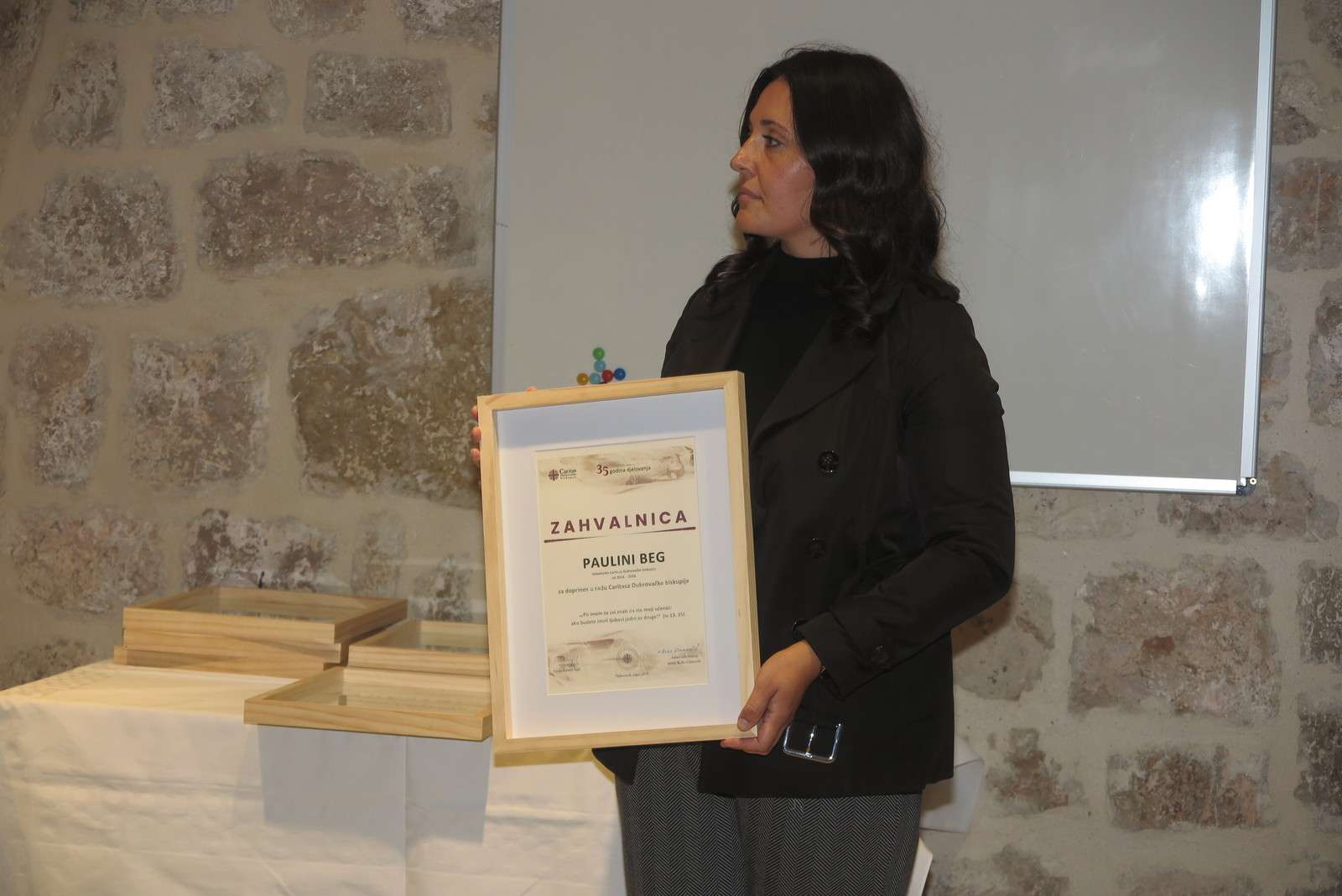 Program, koji je zbog kišnog vremena premješten u Pinakoteku, moderirala je zamjenica ravnateljice Marija Đurović. Predsjednik biskupijskog Caritasa mons. Ivica Pervan zahvalio je svima onima kojima je Caritas u srcu i u djelu te podijelio zahvalnice dugogodišnjim volonterima, suradnicima i dobročiniteljima Caritasa uz želju da Gospodin dobro djelo nagradi i da se dobra suradnja nastavi i dalje. Posebna zahvalnost upućena je bivšoj ravnatelji Sanji (Šanje) Uženija. U prostoru Pinakoteke bila je postavljena i izložba radova Centra za rehabilitaciju Josipovac. Kupovinom lijepih slika i drugih izložaka moglo se pomoći Centru kojeg vodi ravnatelj Toni Đerek.