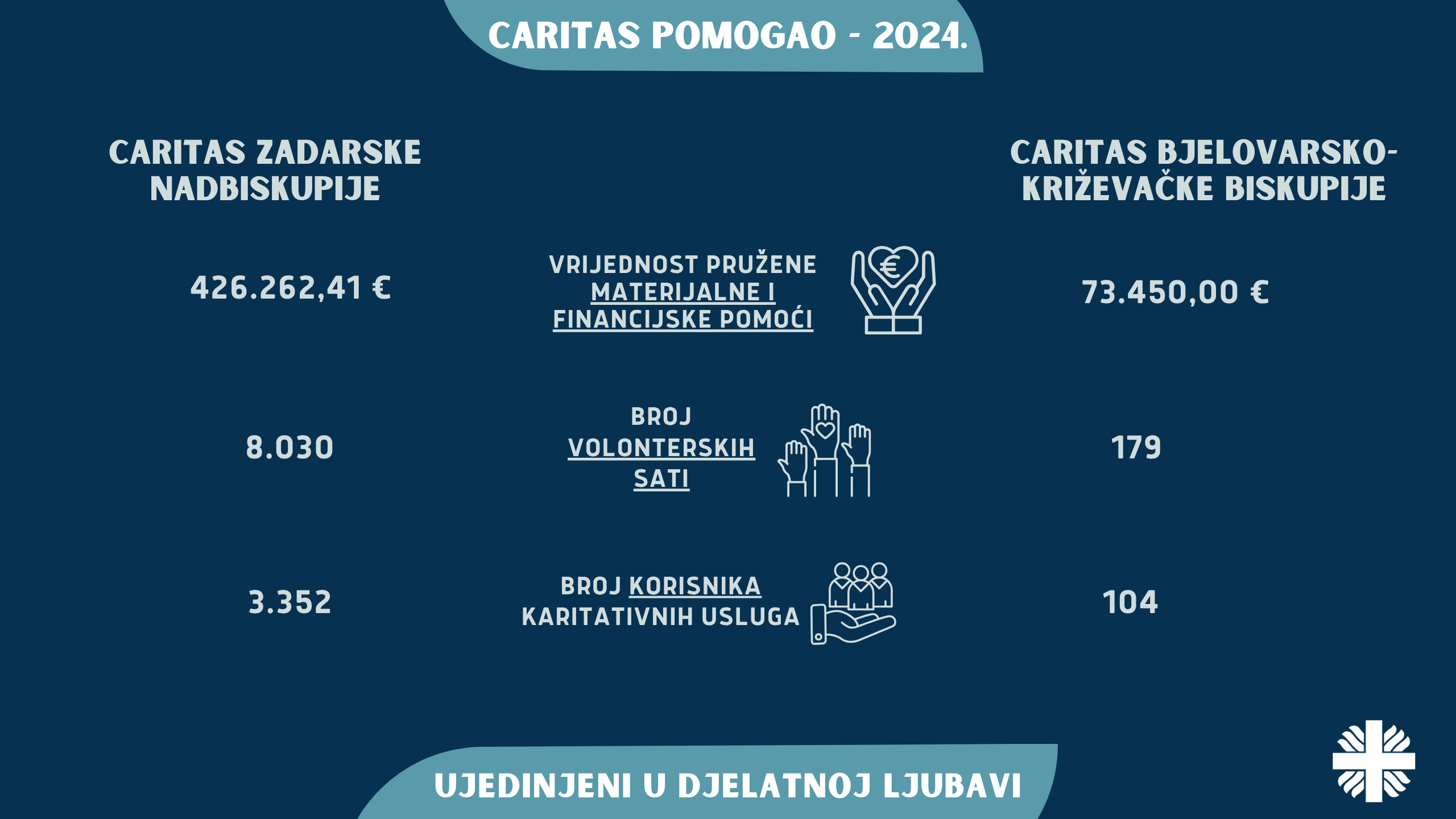 Djelatnost Caritasa podupiru i brojni volonteri čiji vrijedan angažman se ugrađuje u svo dobro koje Caritasi čine. Tako je u Caritasu Bjelovarsko-križevačke biskupije tijekom 2024. godine ostvareno 179 volonterskih sati, dok je u Caritasu Zadarske nadbiskupije ostvareno čak 8.030 volonterskih sati.