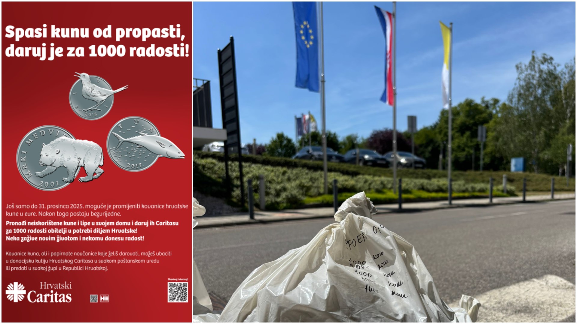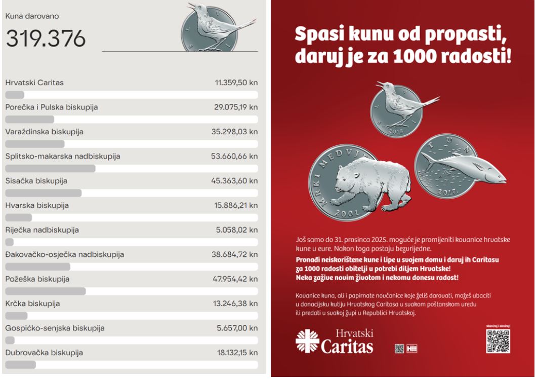 Kovanice kuna i lipa, koje će nakon 31. prosinca 2025. postati bezvrijedne, prikupljaju se u svim poštanskim uredima te u svim župama diljem Hrvatske, a darovana sredstva, nakon zamjene za eure, bit će vraćena u mjesta u kojima su prikupljena, i usmjerena potrebitim korisnicima Caritasove pomoći.