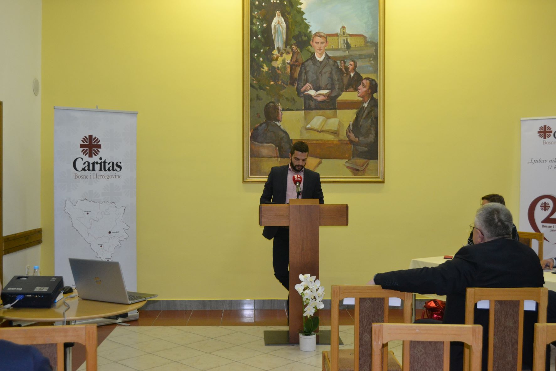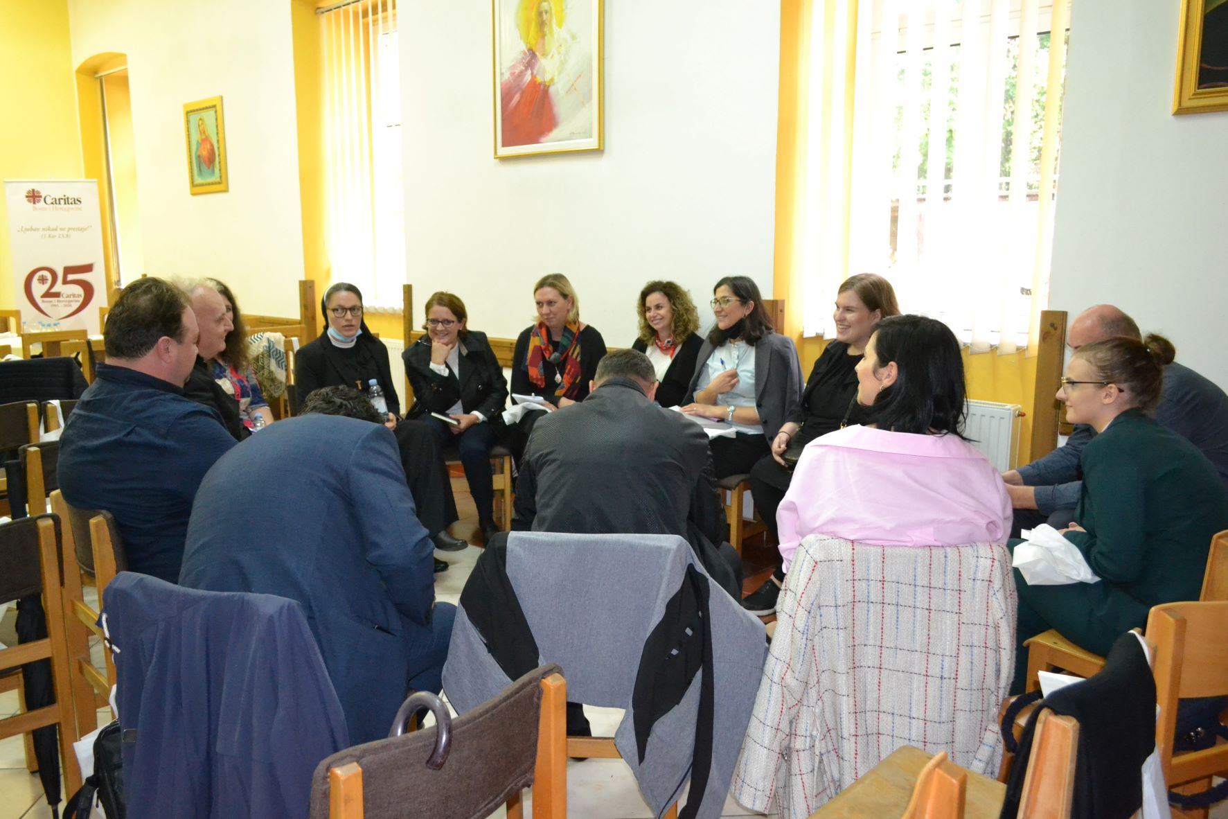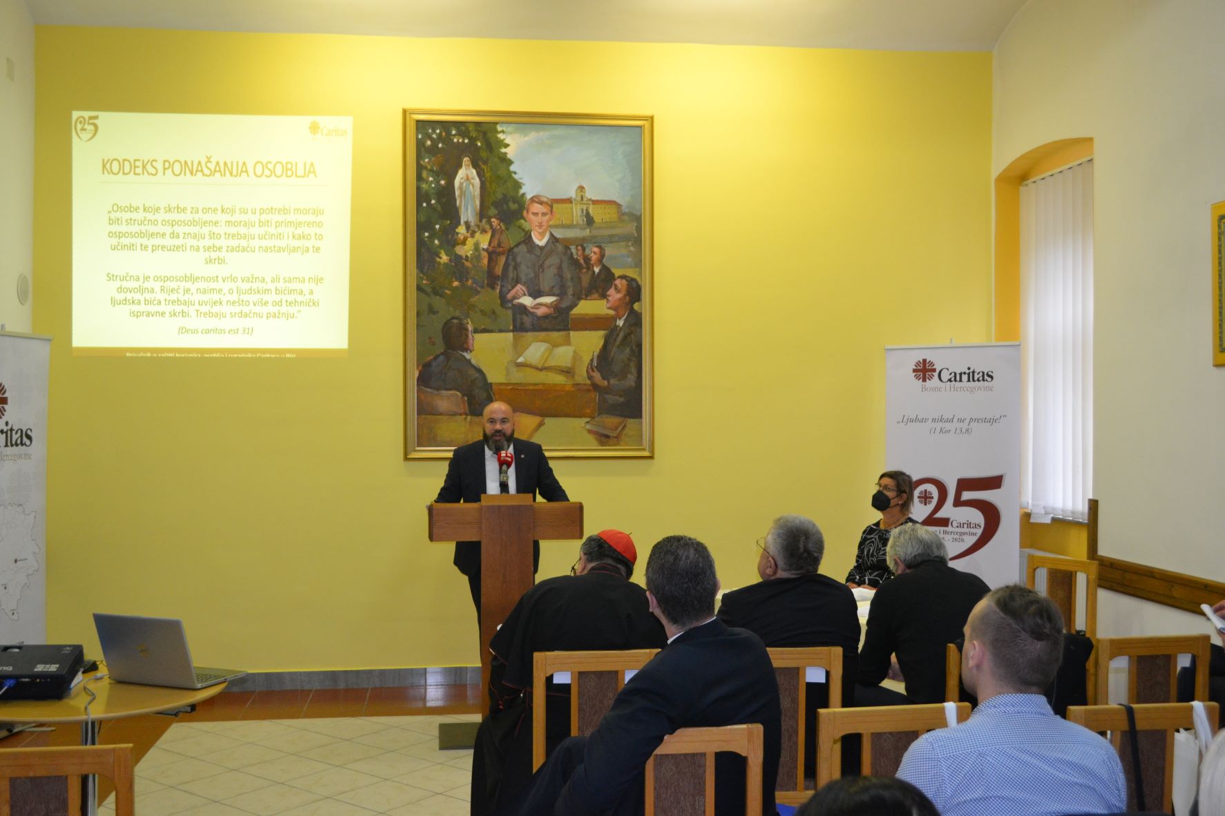 Mons. Tomo Knežević, ravnatelj Caritasa Bosne i Hercegovine, pozdravio je sve nazočne i zahvalio na dolasku. Naveo je kako Caritas BiH već dulji niz godina radi na organizacijskom razvoju, te kako je područje zaštite korisnika i suradnika jedna od ključnih tema razvoja Caritasa. Dodao je kako je pripremljen Priručnik za zaštitu korisnika i osoblja Caritasa kojeg Caritas stavlja na raspolaganje svim sudionicima, a koji se isto tako može naći na mrežnoj stranici Caritasa BiH: www.caritas.ba. Mons. Knežević je posebno istaknuo činjenicu kako svi unutar Crkve, biskupi, svećenici, redovnici i redovnice, ali i vjernici laici imaju pravo i odgovornost zaštiti djecu i ranjive skupine od svakog oblika nasilja i uznemiravanja.